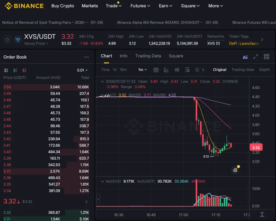 Venus (XVS) plunged more than 30% in approximately 10 minutes, beginning around 8:05 a.m. UTC on Jan. 29. The token's price fell from around $4.40 to a low of $3.12. As of press time, XVS is trading at $3.32 on the Binance spot market against USDT, down 31.83%.