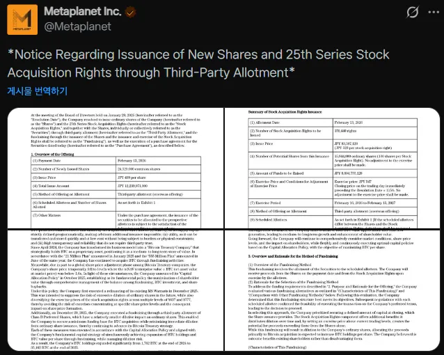 MetaPlanet, a publicly listed Japanese firm accumulating Bitcoin, announced plans to purchase additional BTC by raising up to 21 billion yen ($130 million). The company detailed the plan in an official document regarding its 25th issuance of stock warrants, which it shared on its official X account.