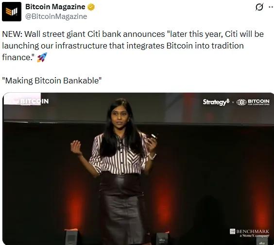 Citigroup plans to launch infrastructure by the end of this year to integrate Bitcoin into the existing financial system, Bitcoin Magazine's X account reported. The media outlet added that this would effectively make Bitcoin a medium for banking transactions.