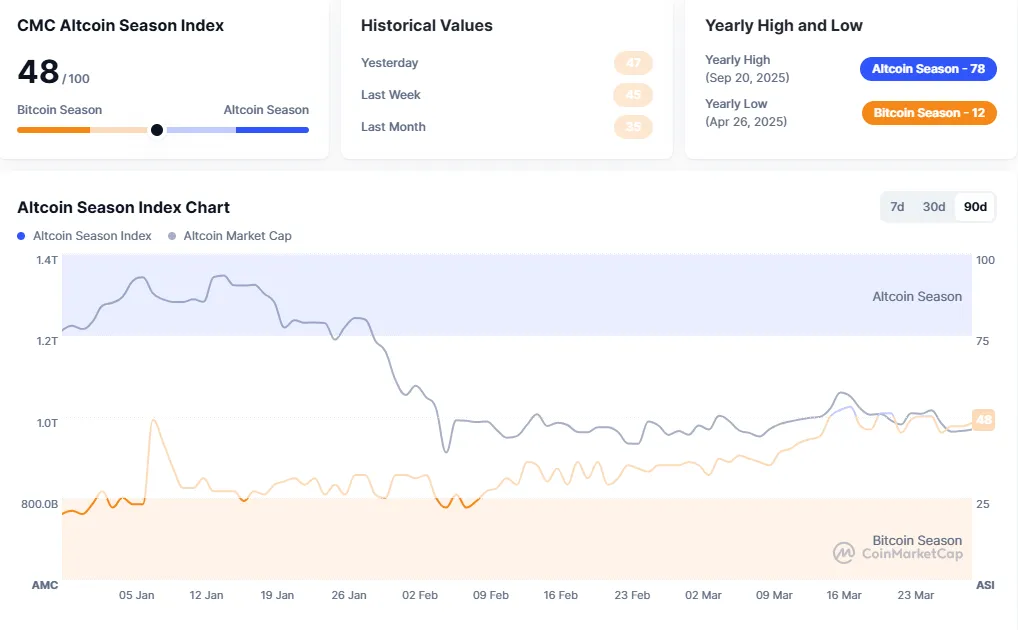The Altcoin Season Index from crypto data platform CoinMarketCap is currently at 48. The index is calculated by comparing the price performance of the top 100 coins by market capitalization, excluding stablecoins and wrapped coins, against Bitcoin. An 'altcoin season' is declared when 75% of these top coins have outperformed Bitcoin over the last 90 days. If this threshold is not met, it is considered a 'Bitcoin season.' A score closer to 100 indicates an altcoin season.