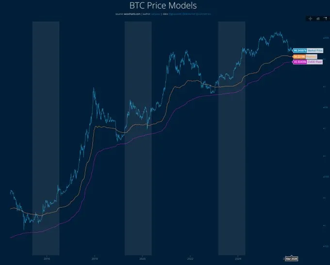 On-chain analyst Willy Woo stated on X that Bitcoin's bottom price could potentially form in the $46,000 to $54,000 range. He noted that this prediction is based on traditional on-chain models. According to Woo, an indicator representing capital flow into BTC has shown continuous outflows since November of last year. He also pointed out that the Cumulative Value Days Destroyed (CVDD) bottom model, which features a rising baseline over time, currently indicates a value of approximately $45,500.
