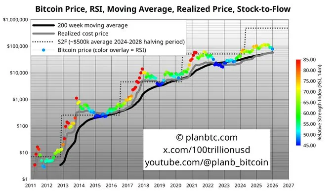 Bitcoin has officially entered a bear market phase, according to an analysis by well-known market analyst PlanB. He noted that the BTC/USD monthly candle for January closed at $78,635, a 38% decline from its all-time high. PlanB stated that the Relative Strength Index (RSI) has fallen below 50, which he identifies as a formal signal for a bear market. He also pointed out that the 200-week Exponential Moving Average (EMA) and the realized price are gradually declining to $58,000 and $55,000, respectively. Based on historical trends, PlanB suggested that Bitcoin could fall further to these levels. However, he added that since the recent bull market showed relatively weak bullish signals, the corresponding bear market might also be limited in scope.