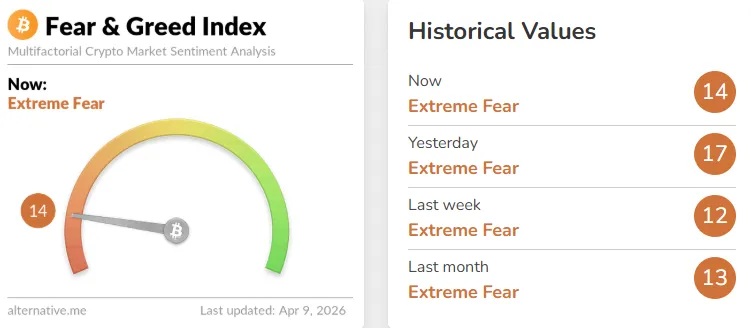 The Crypto Fear & Greed Index from data provider Alternative has dropped three points from yesterday to 14, with market sentiment remaining in a state of extreme fear. The index measures market sentiment on a scale of 0 (extreme fear) to 100 (extreme optimism). It is calculated based on volatility (25%), trading volume (25%), social media mentions (15%), surveys (15%), Bitcoin's market cap dominance (10%), and Google search volume (10%).