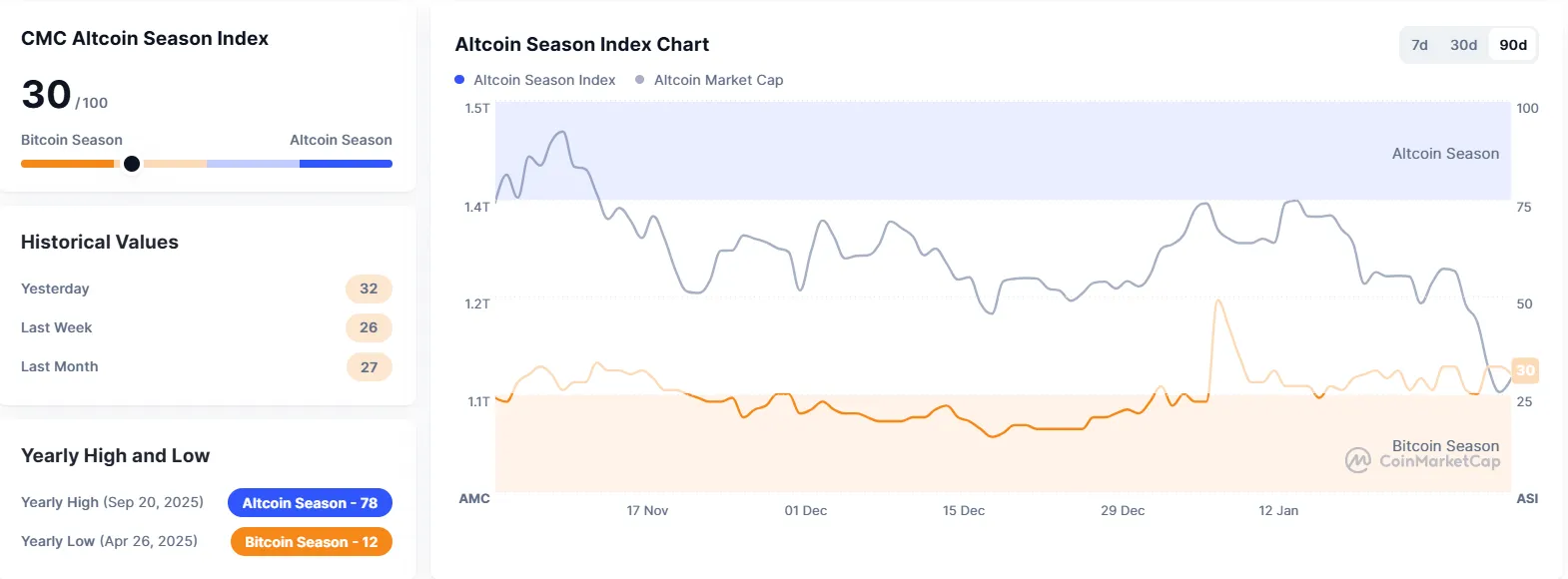The Altcoin Season Index from crypto data platform CoinMarketCap has fallen two points from yesterday to 30. The index is calculated by comparing the price performance of the top 100 coins by market capitalization (excluding stablecoins and wrapped tokens) against Bitcoin. If 75% of the top 100 coins have outperformed Bitcoin over the last 90 days, it is considered an 'altcoin season.' Otherwise, it is considered a 'Bitcoin season.' A reading closer to 100 indicates an altcoin season.