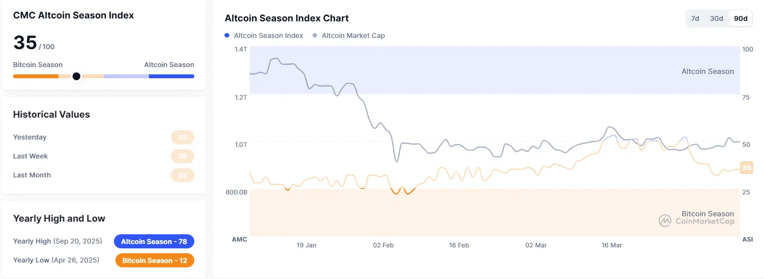 CoinMarketCap's Altcoin Season Index has risen one point from yesterday to 35. The index determines whether it is an altcoin season by comparing the performance of the top 100 cryptocurrencies by market capitalization, excluding stablecoins and wrapped tokens, against Bitcoin. An altcoin season is declared when 75% of these top coins outperform Bitcoin over the preceding 90 days, with a score closer to 100 indicating a stronger season.